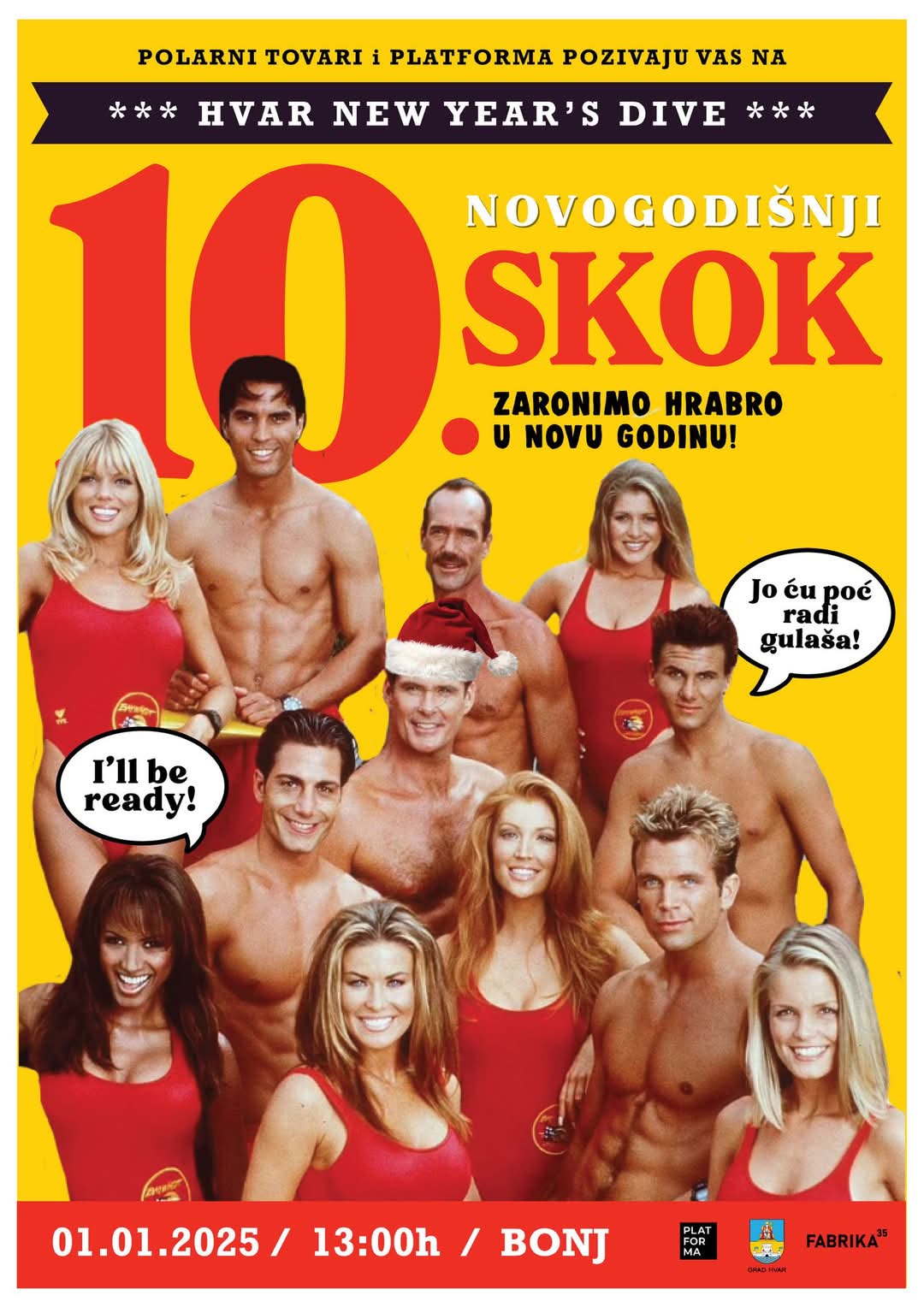 Pripremite se za nezaboravan početak nove godine uz 10. Novogodišnji skok na Hvaru! Tradicionalni zaron u more, organiziran od strane udruga Polarnih tovara i Platforme, održat će se 1. siječnja 2025. godine u 13:00 sati na kultnoj lokaciji Bonj.