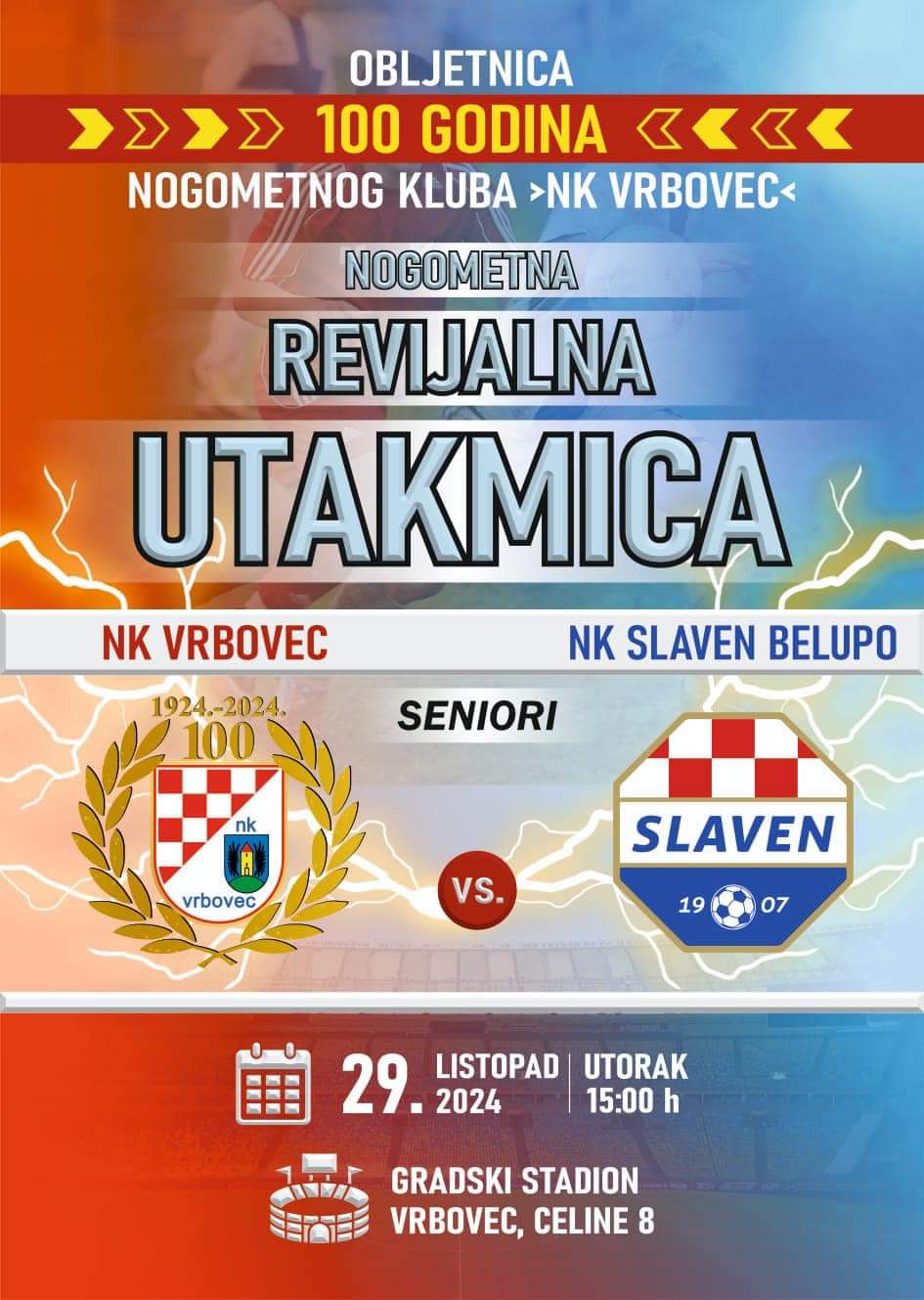 Nogometni klub Vrbovec obilježava 100 godina postojanja velikom revijalnom utakmicom protiv NK Slaven Belupo, koja će se održati 29. listopada 2024. godine. Ovaj poseban događaj bit će pravi spektakl za sve ljubitelje nogometa, a utakmica će se odigrati na Gradskom stadionu u Vrbovcu, s početkom u 15:00 sati.