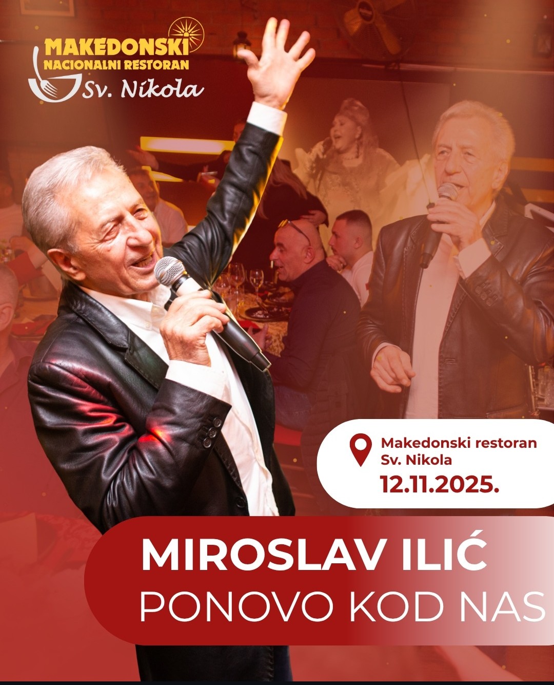 Nakon rasprodanog koncerta u Areni Zagreb, legenda narodne glazbe Miroslav Ilić vraća se 12. studenoga 2025. u intimnu atmosferu Makedonskog restorana Sv. Nikola! Uživajte u večeri ispunjenoj hitovima, vrhunskom hranom i vinima – rezervirajte svoje mjesto na vrijeme! 🍷🎶
