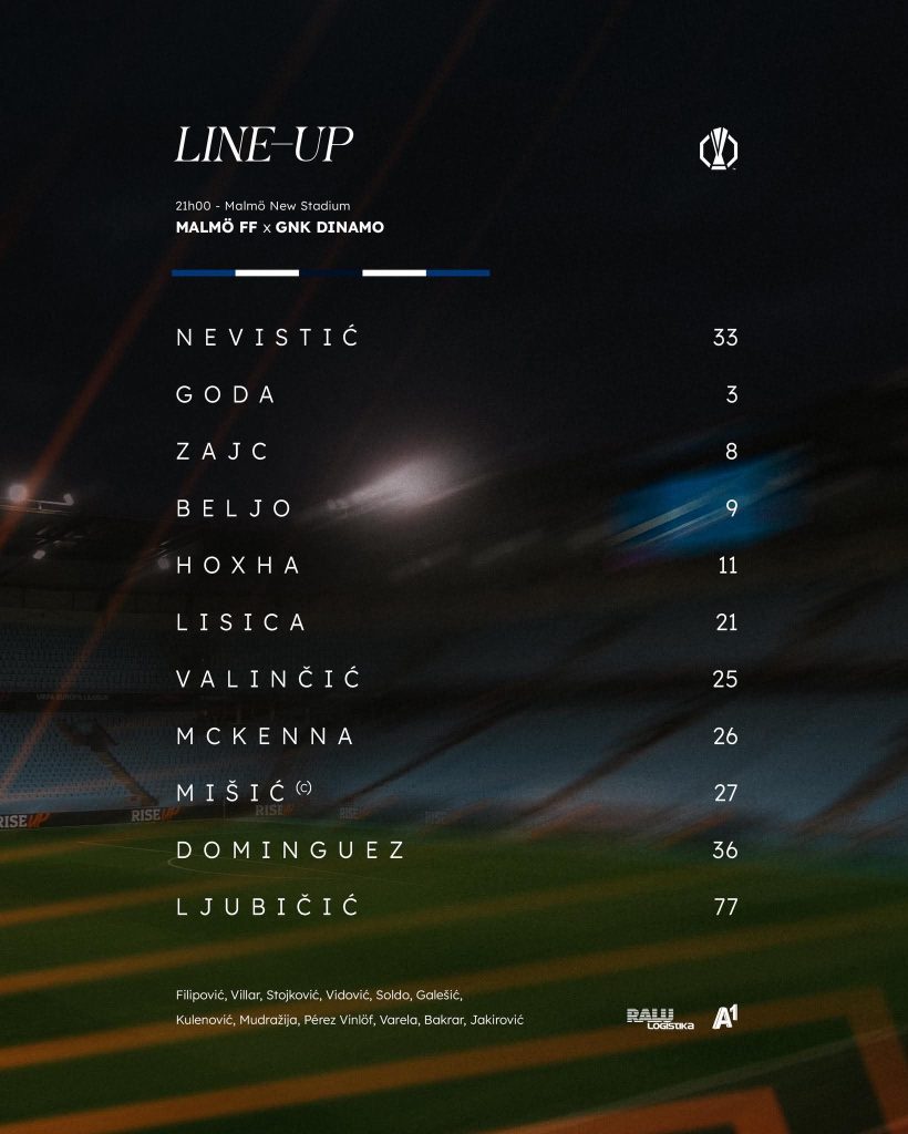 GNK Dinamo objavio je početni sastav za večerašnji europski dvoboj protiv Malmö FF-a u Švedskoj. Pogledajte tko kreće od prve minute na Malmö New Stadiumu i kako izgleda momčad Sergeja Jakirovića.
