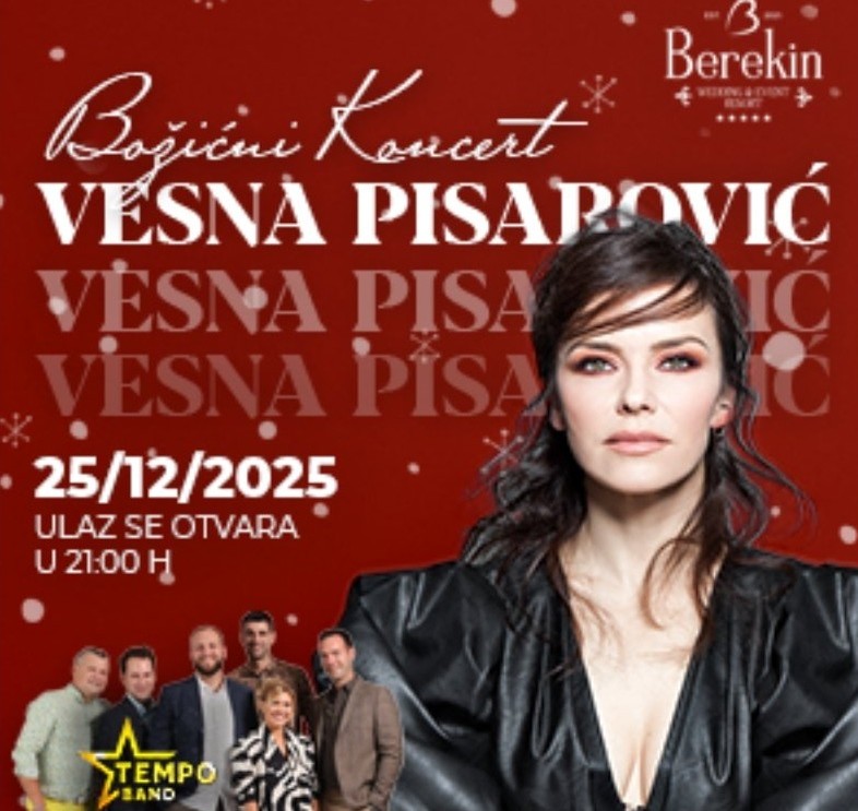 Vesna Pisarović nastupa na Božić 25.12.2025. u ekskluzivnom restoranu Berekin u Bibinjama! Uživajte u božićnom koncertu, glazbi uživo i sjajnoj atmosferi uz Tempo Band. Ulaz od 21:00 h, karte dostupne na Eventimu.