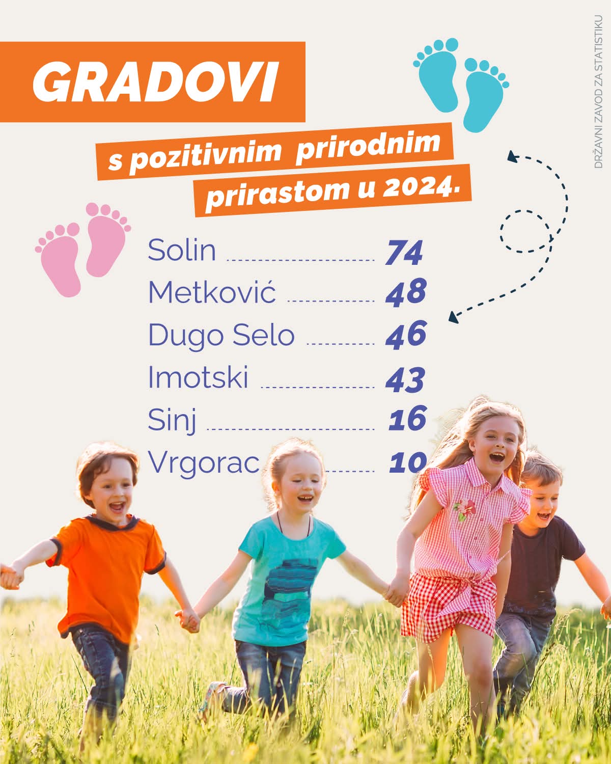 Prema najnovijim podacima Državnog zavoda za statistiku (DZS), u Hrvatskoj je tijekom 2024. godine zabilježeno tek nekoliko gradova s pozitivnim prirodnim prirastom – što znači da je broj rođenih bio veći od broja umrlih. Iako su brojke skromne, one pokazuju pozitivne demografske trendove u pojedinim sredinama.