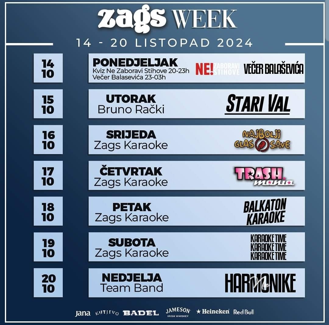 Zags, omiljeno okupljalište studenata, nudi tjedni noćni program ispunjen odličnim zabavnim sadržajima. Od kvizova i karaoke večeri do live svirki, svaki dan donosi nešto posebno. Ako tražite gdje se zabaviti u Zagrebu, Zags je idealno mjesto za vas!