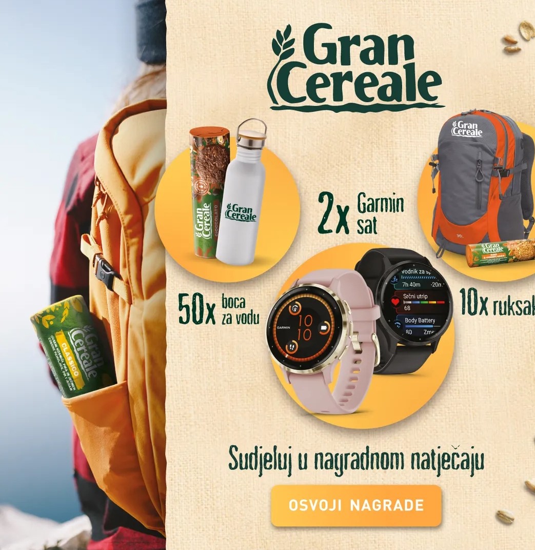 Gran Cereale nagradni natječaj donosi uzbudljive nagrade za ljubitelje prirode i zdravih užina! Ako ste ljubitelj aktivnog načina života, ovo je vaša prilika da osvojite fantastične nagrade koje će vam pomoći u svakodnevnim avanturama. Od Garmin satova, preko praktičnih ruksaka, do boca za vodu – Gran Cereale vas nagrađuje za vašu vjernost!