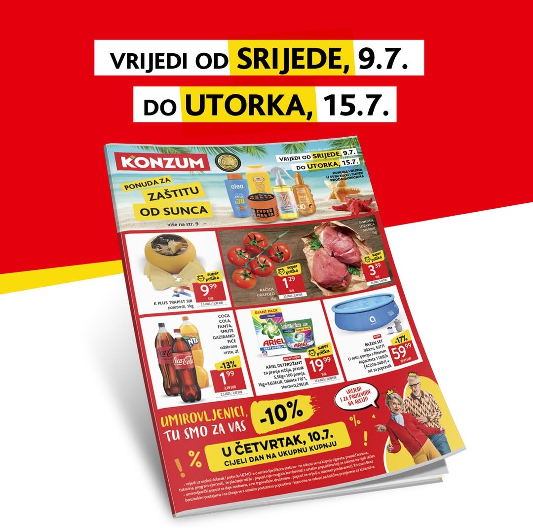 Otkrij nove akcije u Konzumu od 9.7. do 15.7.2025! Svježe voće, povrće, meso, piće i ljetni dodaci po sniženim cijenama – iskoristi popuste i uštedi!