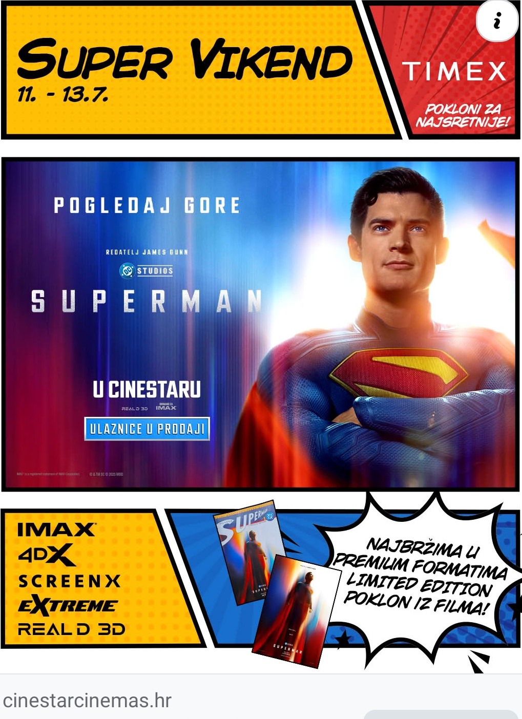 🎁 Posebna ponuda za najbrže – svi koji kupe ulaznicu za film Superman u premium formatima dobit će limited edition poklon iz filma – samo u CineStaru i samo za najbrže!
