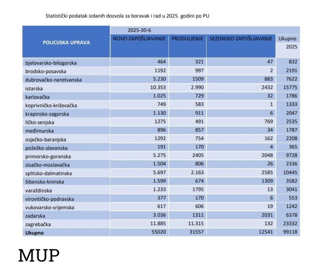 Ministarstvo unutarnjih poslova (MUP) objavilo je statistiku izdanih dozvola za boravak i rad do 30. lipnja 2025. godine. Ukupno je izdano 99.118 dozvola na razini cijele Hrvatske, a podaci pokazuju značajne regionalne razlike.