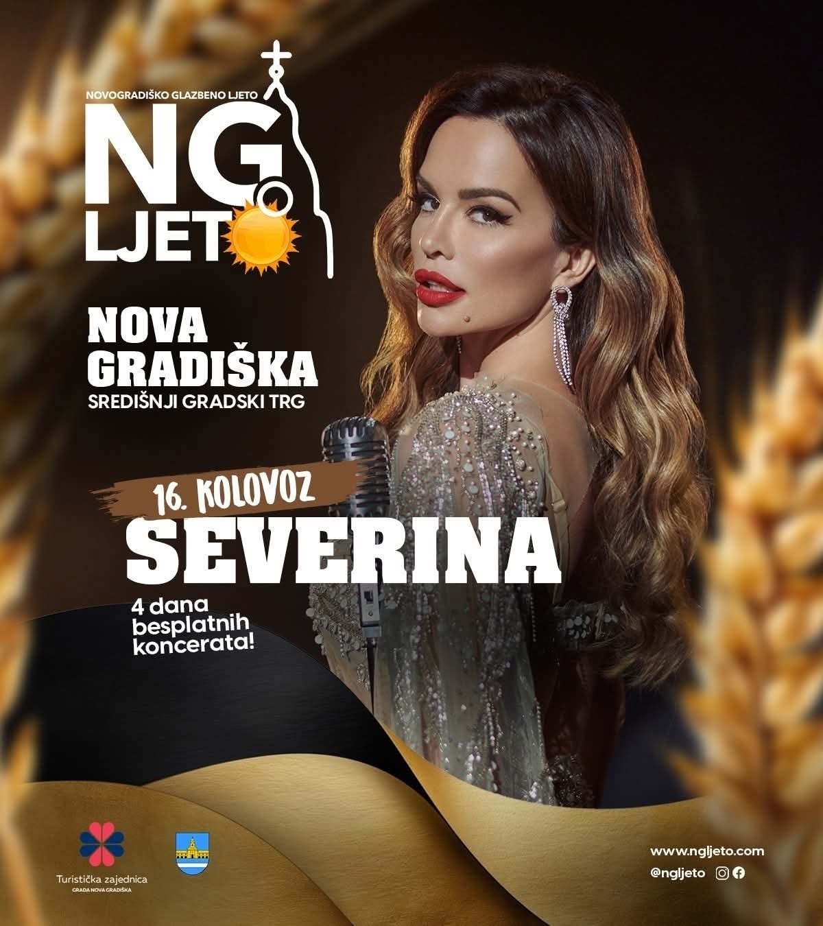 Doživite nezaboravnu ljetnu večer uz Severinu 16. kolovoza na središnjem gradskom trgu u Novoj Gradiški! U sklopu NG Ljeta očekuju vas 4 dana besplatnih koncerata i vrhunske zabave.