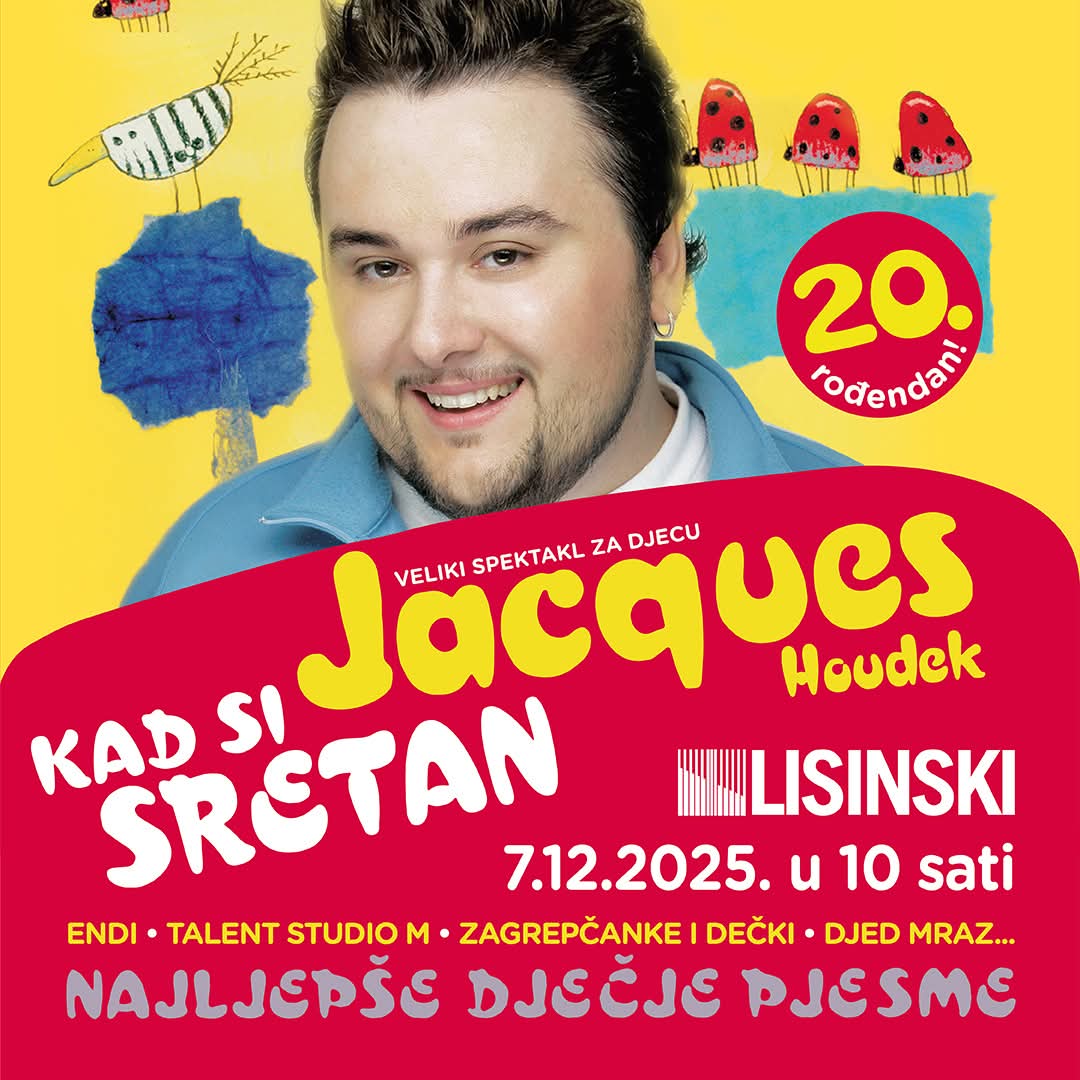 Jedan od najpoznatijih hrvatskih pjevača, Jacques Houdek, vraća se u Koncertnu dvoranu Vatroslava Lisinskog s posebnim koncertom za djecu – “Kad si sretan”. Ovaj nezaboravni glazbeni događaj održat će se 7. prosinca 2025. godine u 10 sati, a donosi najljepše dječje pjesme koje su obilježile odrastanje brojnih generacija.