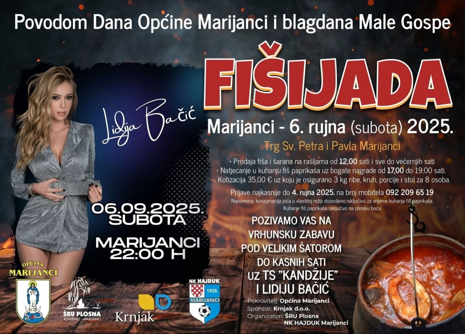 Ne propustite Fišijadu u Marijancima 6. rujna 2025! Uživate u fišu, šaranu na rašljama, bogatom programu i koncertu Lidije Bačić pod velikim šatorom.