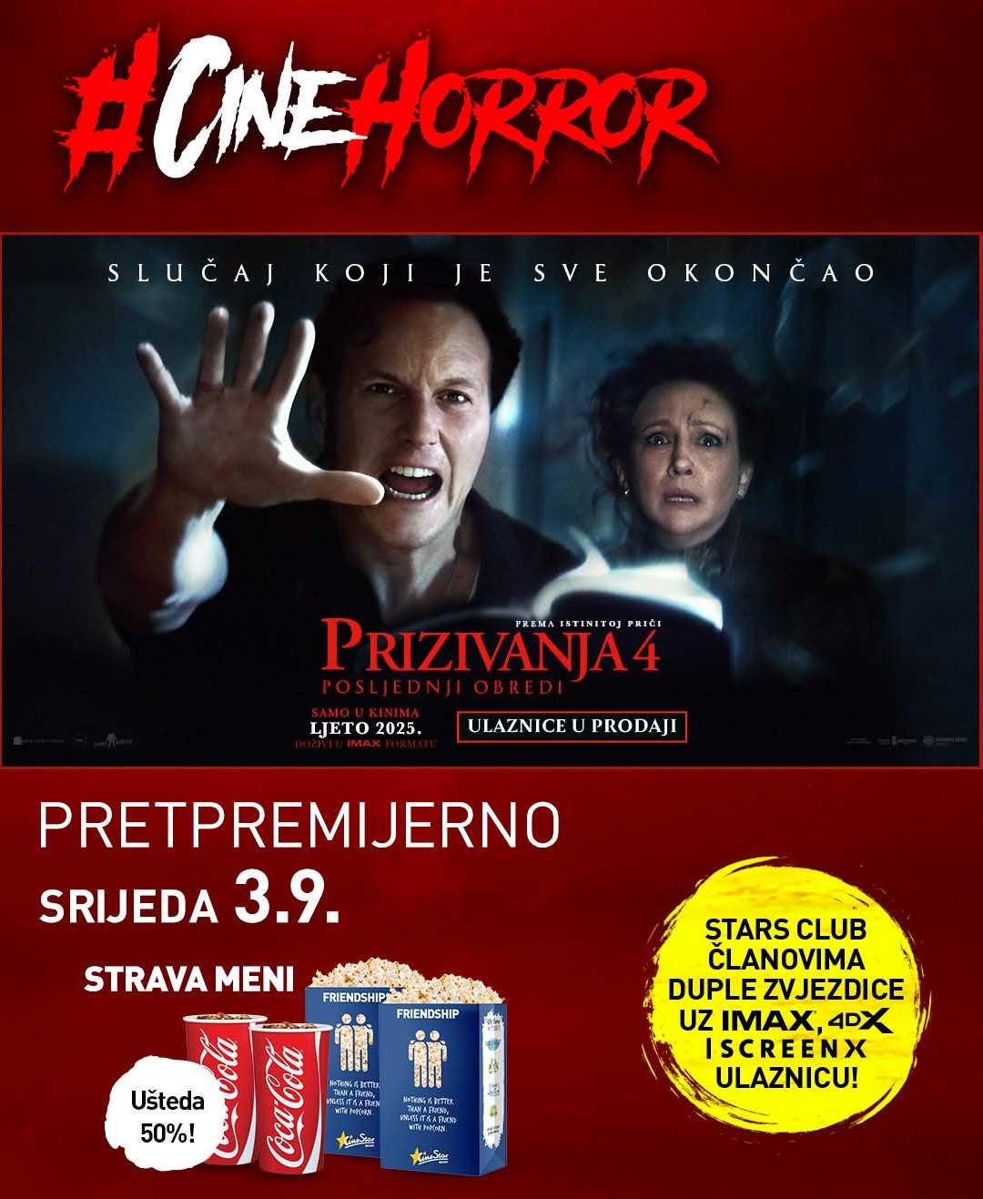 Pripremi se za najstrašniji film godine! 👻 Prizivanja 4: Posljednji obredi stiže pretpremijerno 3.9. na CineHorror večeri u CineStar kinima. Ulaznice u prodaji – osiguraj svoje mjesto i doživi horor spektakl na velikom platnu! 🎬🍿
