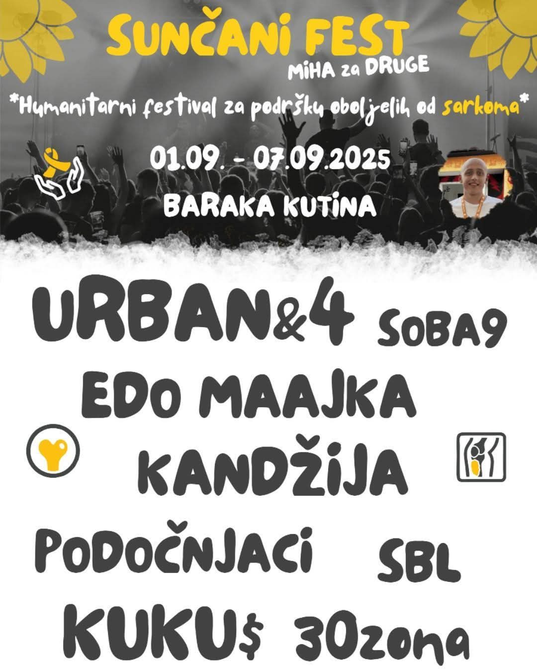Sunčani Fest 2025. u Kutini donosi nastupe Urbana & 4, Ede Maajke, Kandžije, Podočnjaka i mnogih drugih! 🎶 Humanitarni festival podrške oboljelima od sarkoma održava se od 1. do 7. rujna u Baraci Kutina.