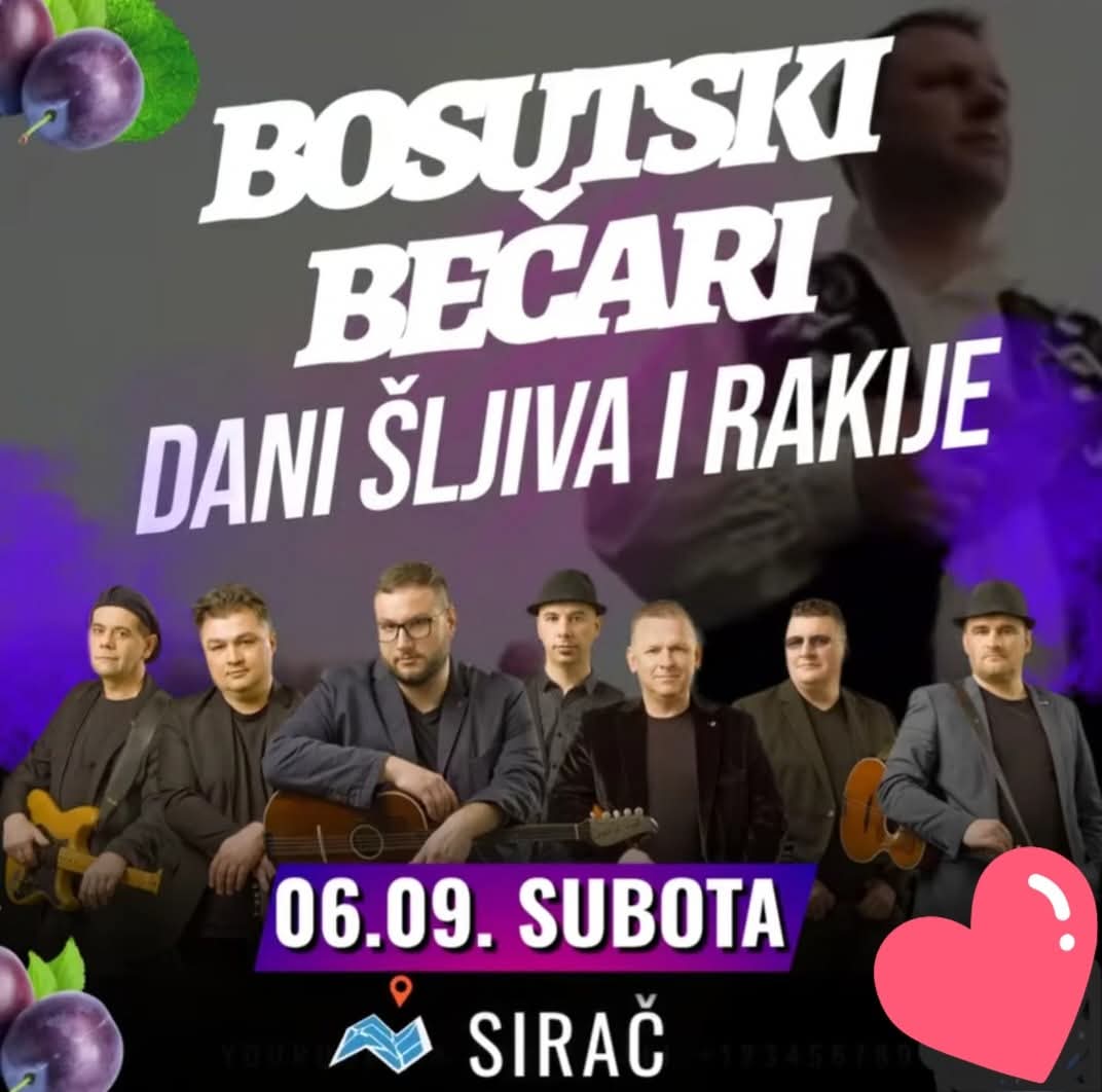 Tradicionalna manifestacija Dani šljiva i rakije u Siraču ove godine donosi pravi glazbeni spektakl – nastup popularnog tamburaškog sastava Bosutski bećari. Program se održava u subotu, 06. rujna 2025., a posjetitelje očekuje spoj vrhunske zabave, domaćih proizvoda i bogate gastro ponude.
