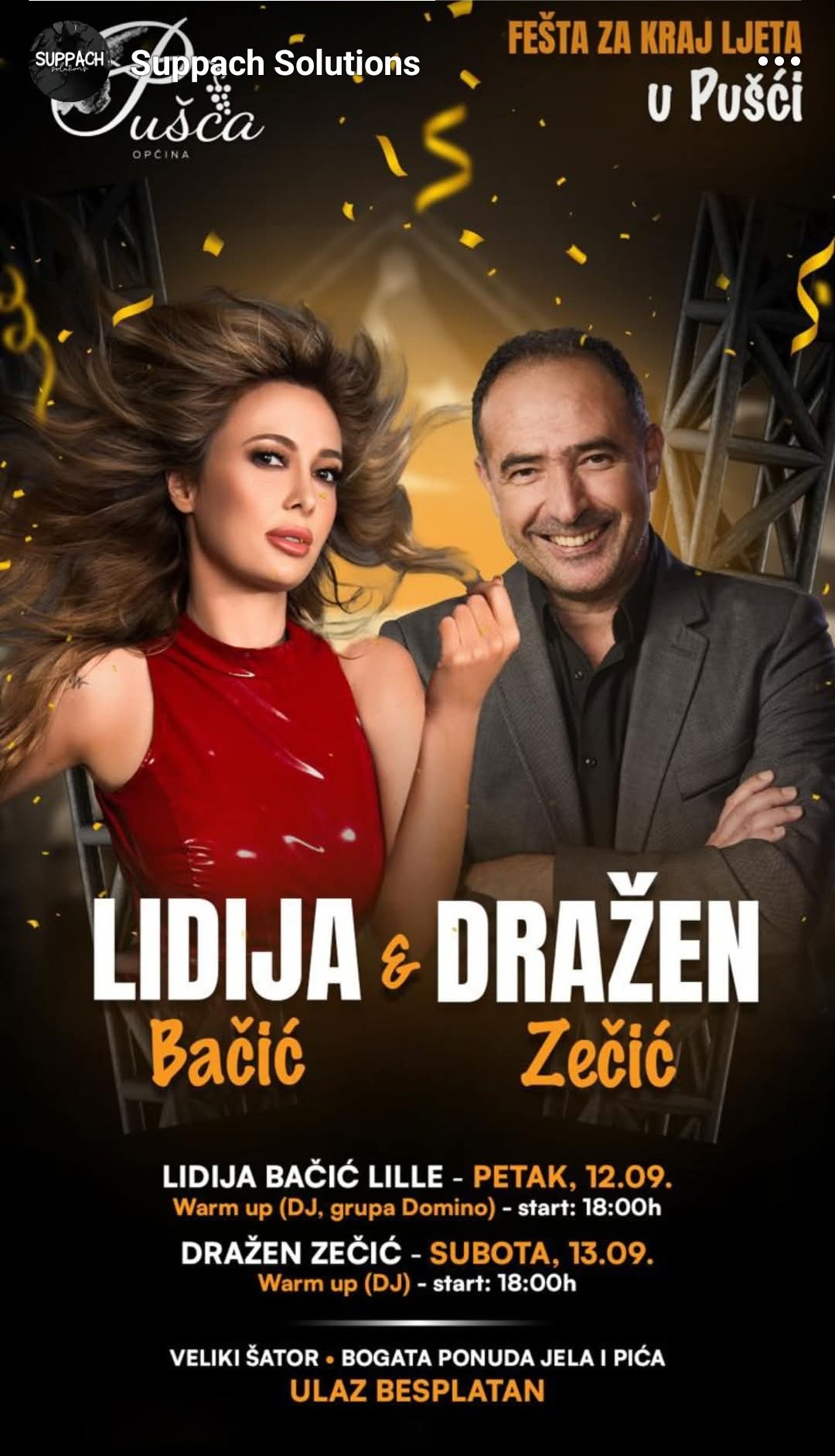 Dođite u Pušću na nezaboravnu feštu za kraj ljeta! Lidija Bačić Lille nastupa u petak 12.9., a Dražen Zečić u subotu 13.9. u velikom šatoru. Čeka vas bogata ponuda jela i pića, odličan DJ warm up i besplatan ulaz!