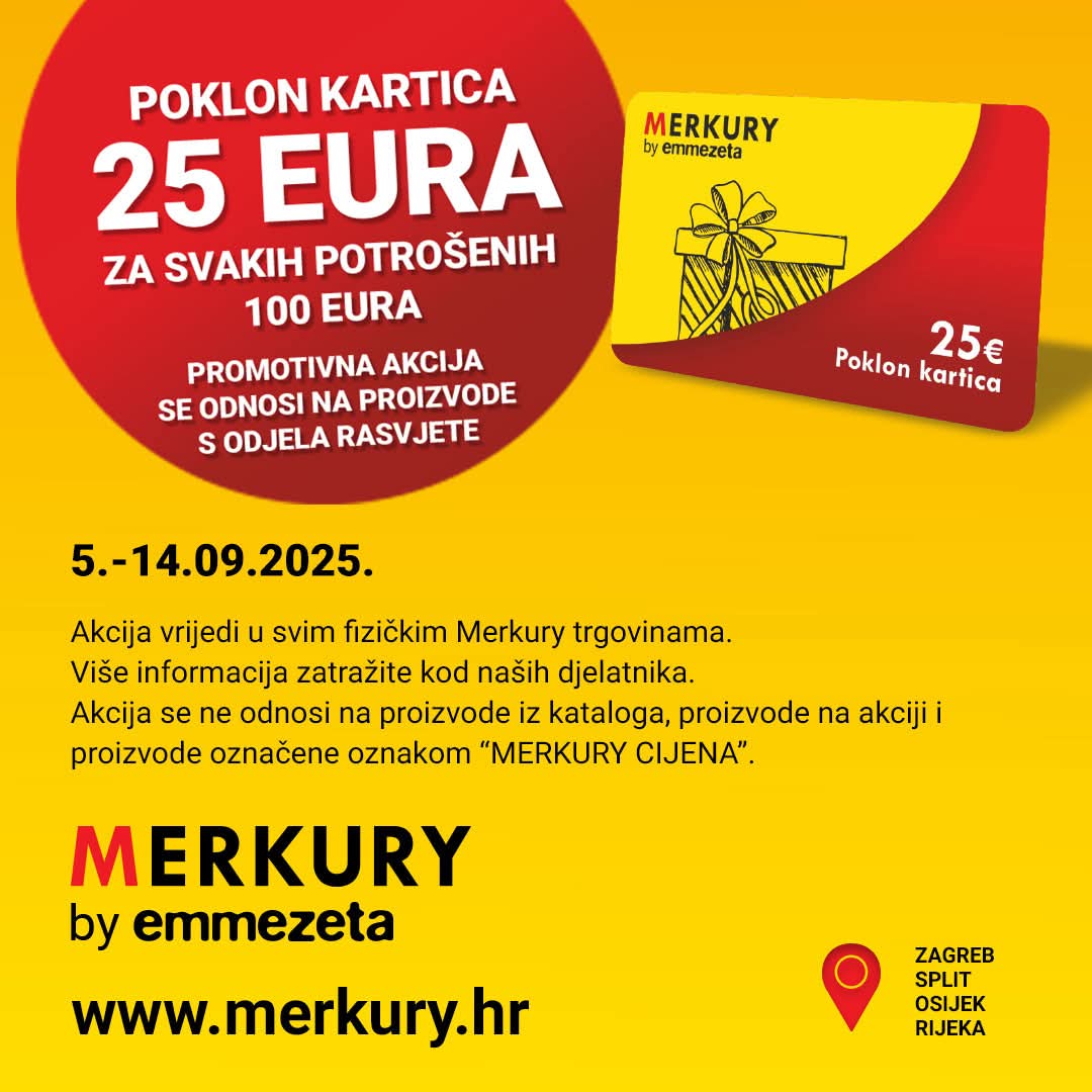 👉 od 5. do 14. rujna 2025. godine, u svim fizičkim Merkury trgovinama (Zagreb, Split, Osijek, Rijeka), za svakih potrošenih 100 € na proizvodima iz odjela rasvjete dobivaš poklon karticu od 25 €.