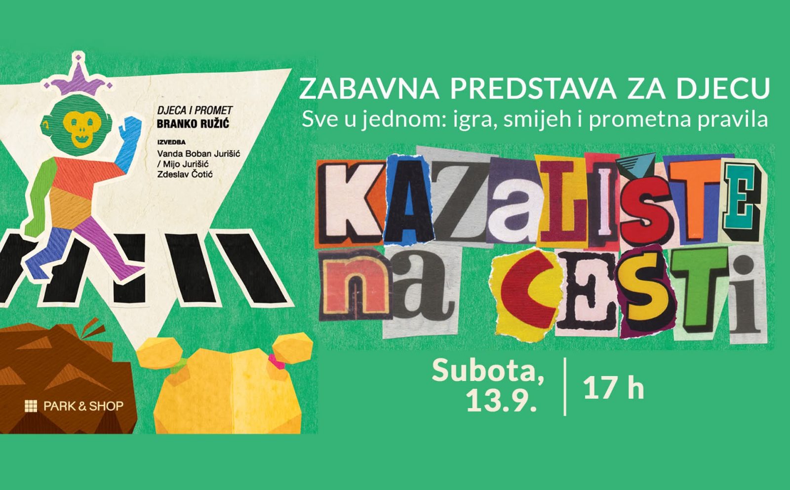 Dođite u Park & Shop 13. rujna u 17h na dječju predstavu “Kazalište na cesti”! Uživajte u igri, smijehu i učenju prometnih pravila uz zabavni program za najmlađe.