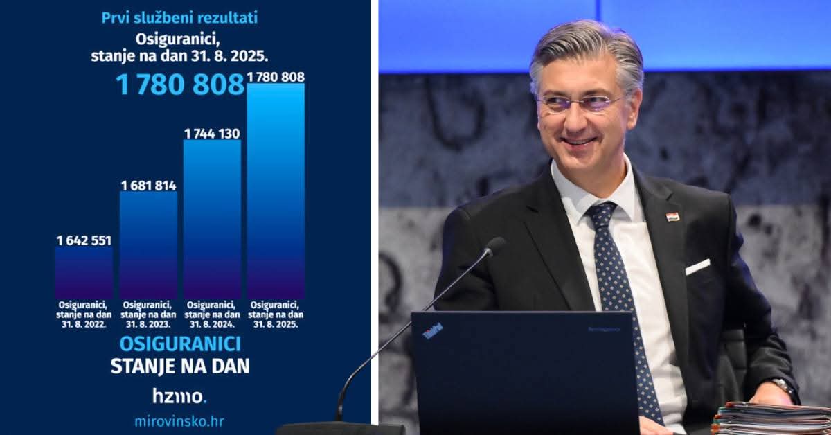 Hrvatska je u kolovozu 2025. imala 1.780.808 osiguranika – 314.566 više nego 2015. Premijer Plenković najavio novi paket pomoći građanima i gospodarstvu te nastavak povoljnijih cijena energenata.