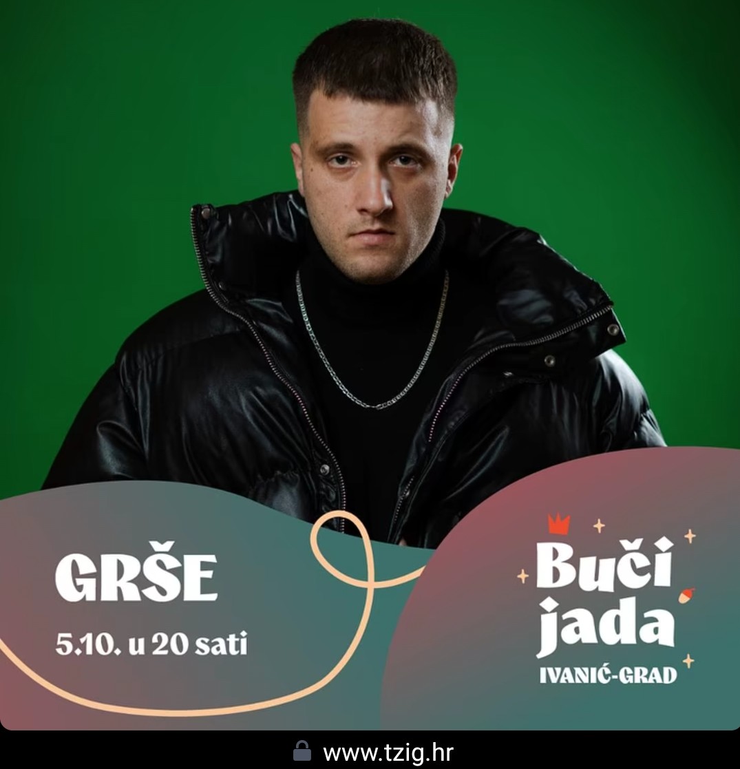 Ne propustite veliki koncert GRŠE-a na Bučijadi u Ivanić-Gradu 5.10.2025. u 20 sati! Dođite na najveći glazbeni spektakl jeseni i uživajte u hitovima popularnog repera.