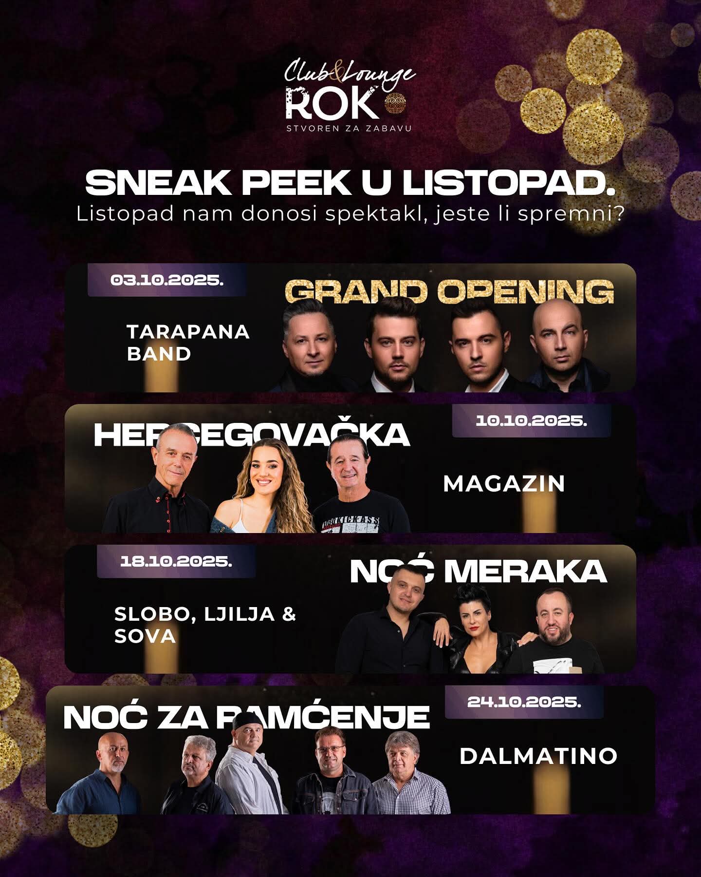 Listopad 2025. u Club & Lounge ROKO donosi spektakularne nastupe – Tarapana Band, Magazin, Slobo, Ljilja & Sova te Dalmatino. Ne propustite večeri za pamćenje uz vrhunsku glazbu i zabavu!