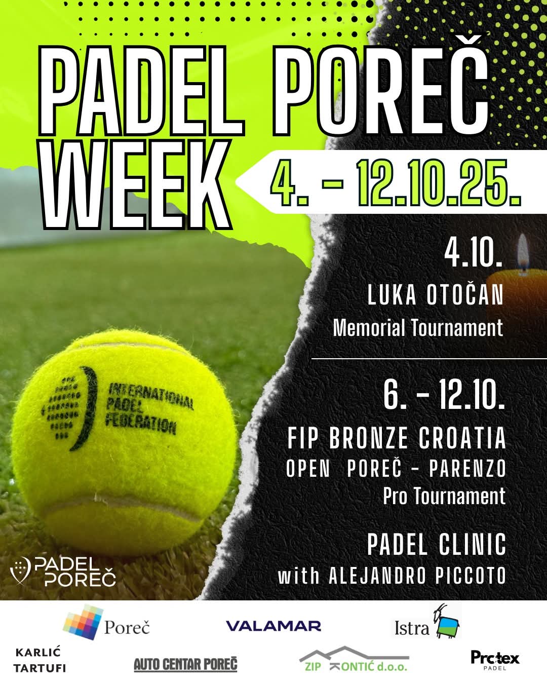 Od 4. do 12. listopada 2025. u Poreču održava se Padel Poreč Week s memorialnim turnirom Luka Otočan, FIP Bronze Croatia Open turnirom i Padel Clinic radionicom s Alejandrom Piccoto.