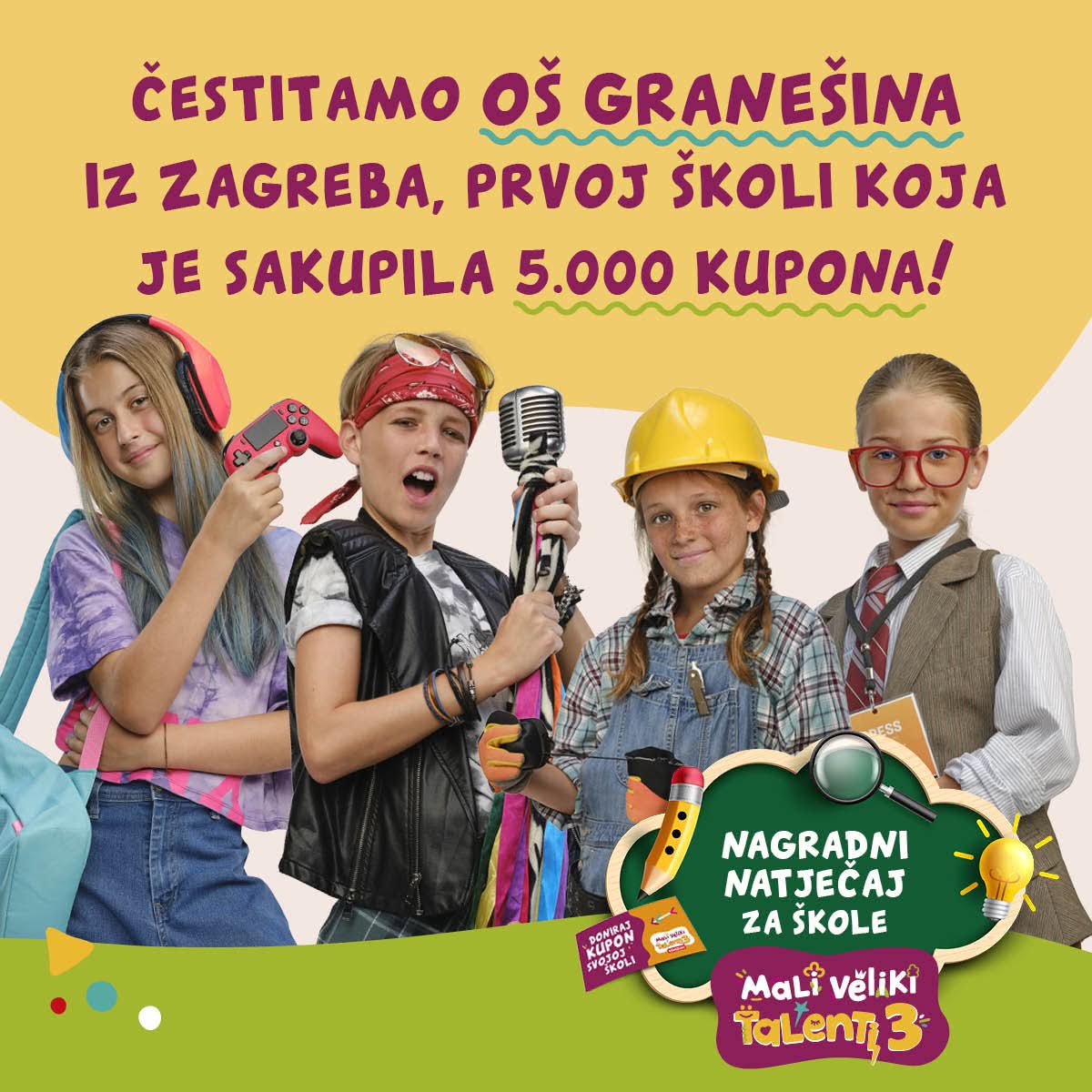 Konzum je objavio radosnu vijest – Osnovna škola Granešina prva je u Hrvatskoj sakupila čak 5.000 kupona u sklopu popularne akcije Mali veliki talenti! 🥳