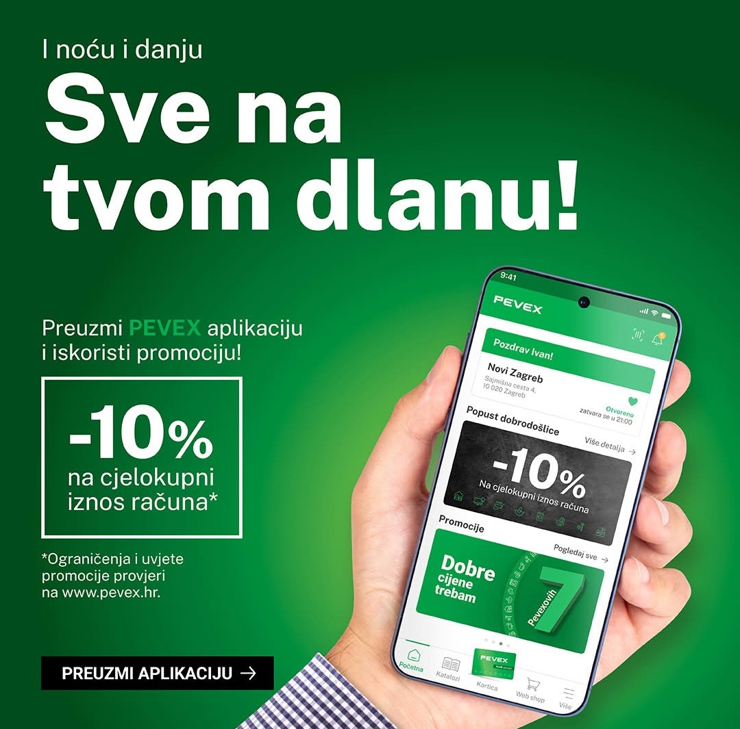 Preuzmi Pevex mobilnu aplikaciju i iskoristi ekskluzivan -10% popusta na cjelokupni iznos računa. Akcija vrijedi do 30.09.2025. – preuzmi aplikaciju i uštedi već danas!