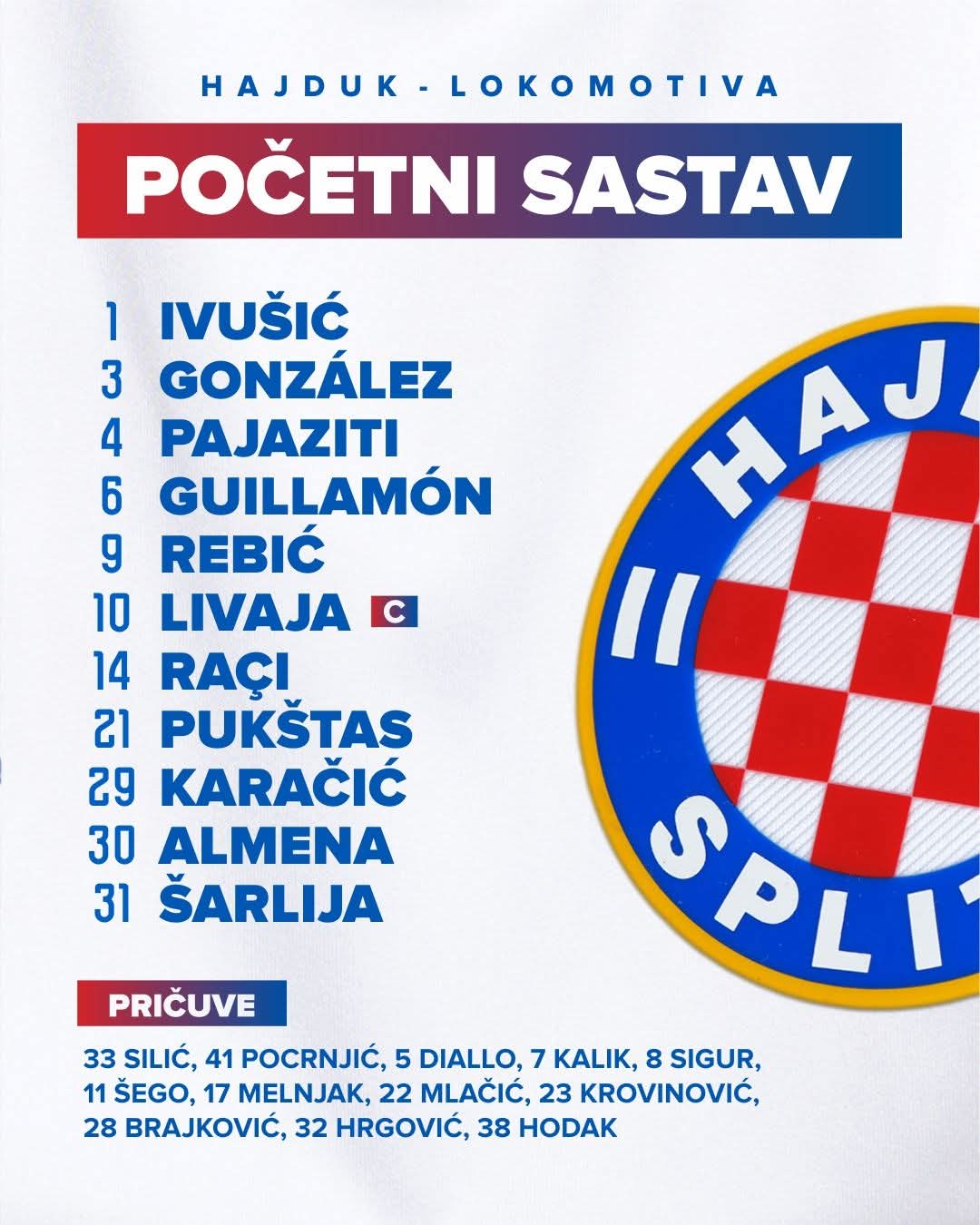 Početni sastav Hajduka za dvoboj protiv Lokomotive jasno pokazuje da momčad ide na pobjedu. Kapetan Marko Livaja predvodi ekipu, a uz njega će veliku ulogu imati i Ante Rebić. Navijače očekuje prava nogometna poslastica i borba za važne bodove.