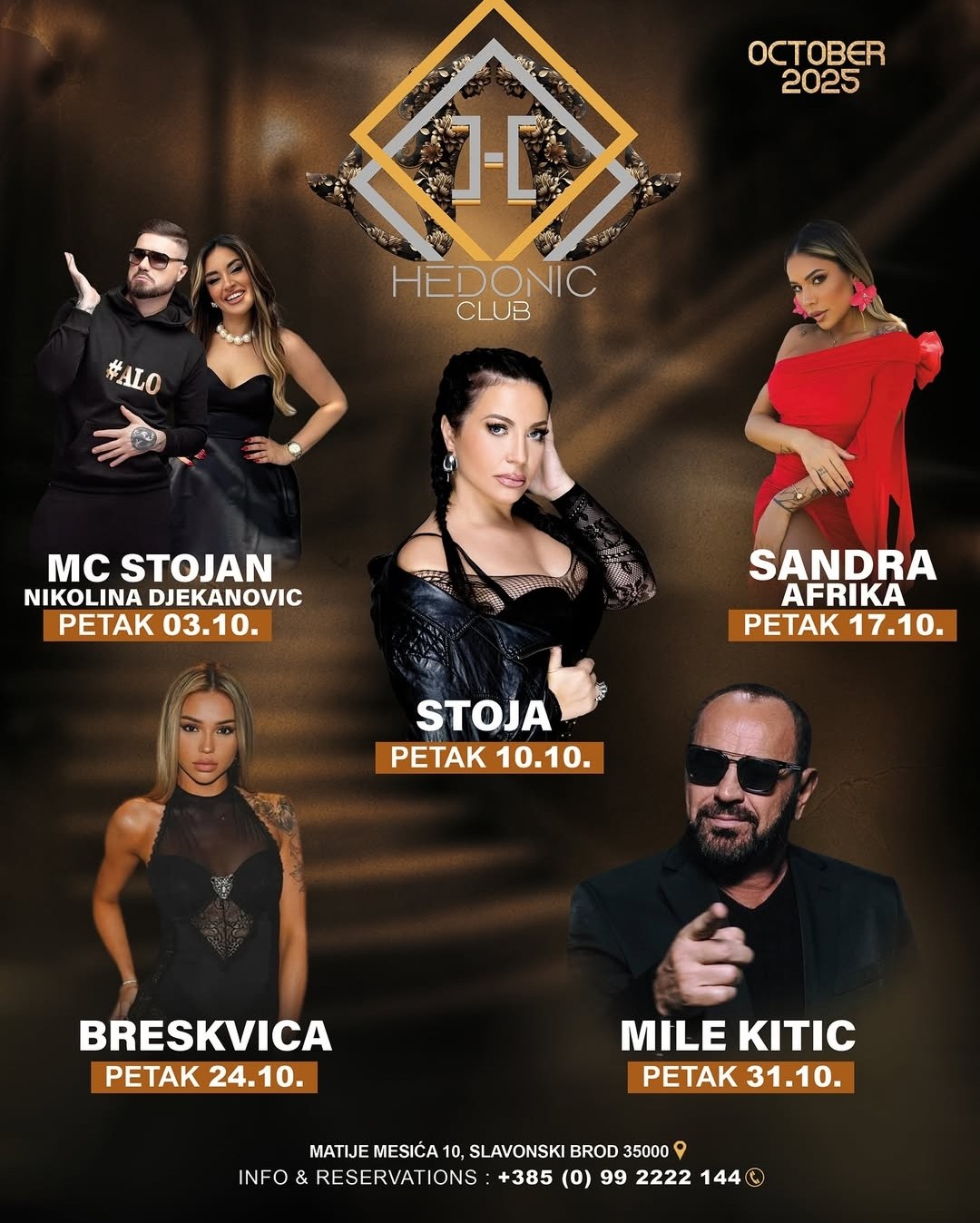 Hedonic Club Slavonski Brod u listopadu 2025. donosi vrhunske nastupe: MC Stojan, Stoja, Sandra Afrika, Breskvica i Mile Kitić. Provjerite datume, rezervirajte stol i ne propustite najbolje noćne provode u Slavonskom Brodu!