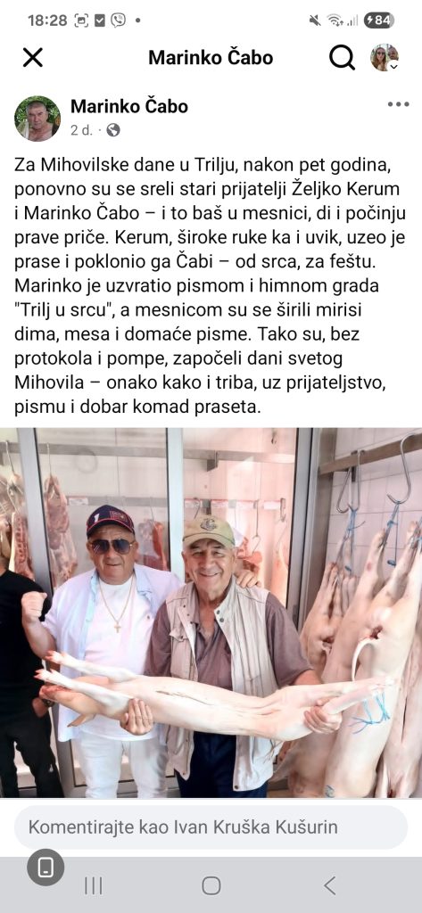 Mihovilski dani u Trilju započeli su emotivno – nakon 5 godina susreli se Željko Kerum i Marinko Čabo. U mesnici je Kerum darovao prase, a Čabo uzvratio pjesmom “Trilj u srcu”.
