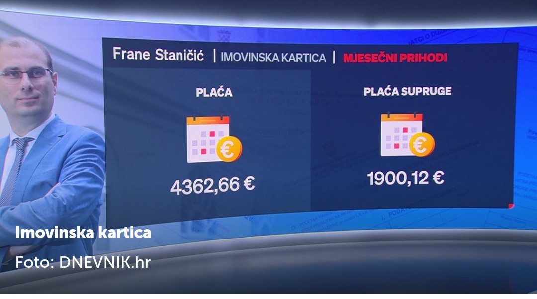 Prema dostupnim podacima, Staničić je do sada primao mjesečnu plaću od 4262 eura neto, dok njegova supruga, zaposlena u Ministarstvu mora, prometa i infrastrukture, ima plaću od oko 1900 eura.