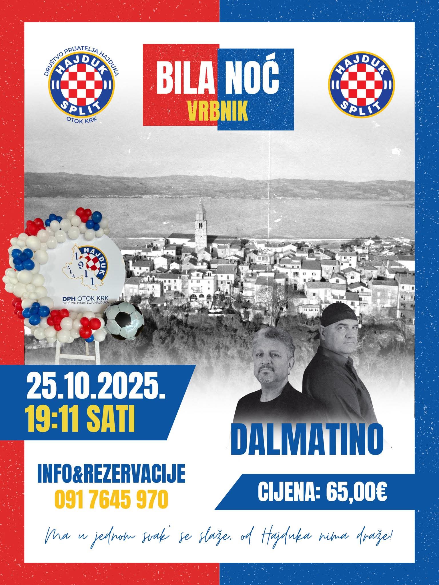 Ovaj jedinstveni događaj okuplja navijače, prijatelje i simpatizere Hajduka, a večer će dodatno zagrijati popularni bend Dalmatino, poznat po bezvremenskim hitovima koji uvijek stvaraju posebnu atmosferu.