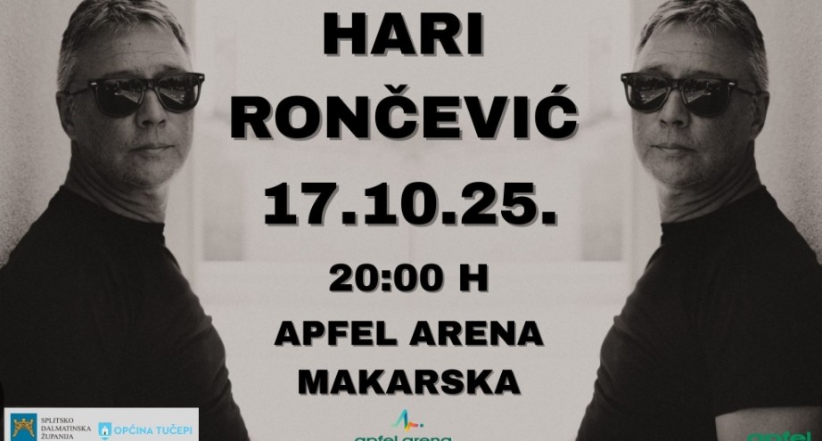 Ne propustite veliki koncert Harija Rončevića u Apfel Areni u Makarskoj 17. listopada 2025. u 20h! Ulaznice po cijeni od 25 € u pretprodaji od 26.9.2025. Osigurajte svoje mjesto na vrijeme!