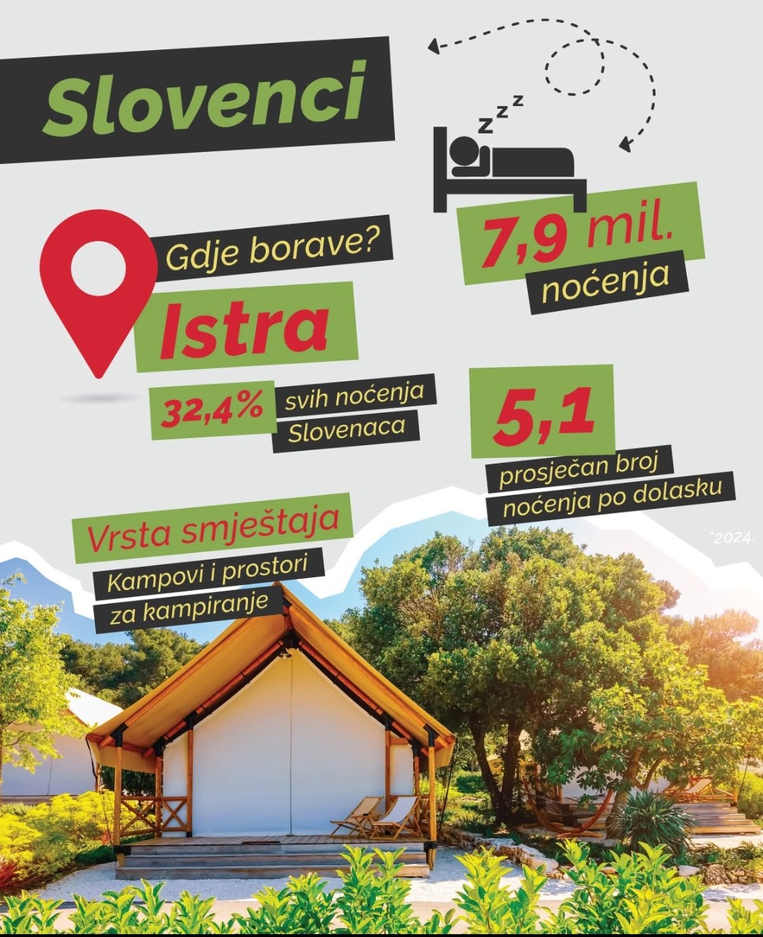 Slovenci su 2024. ostvarili 7,9 milijuna noćenja u Hrvatskoj, najviše u Istri (32,4%). Prosječan boravak traje 5,1 noć, a omiljeni smještaj su kampovi i prostori za kampiranje.
