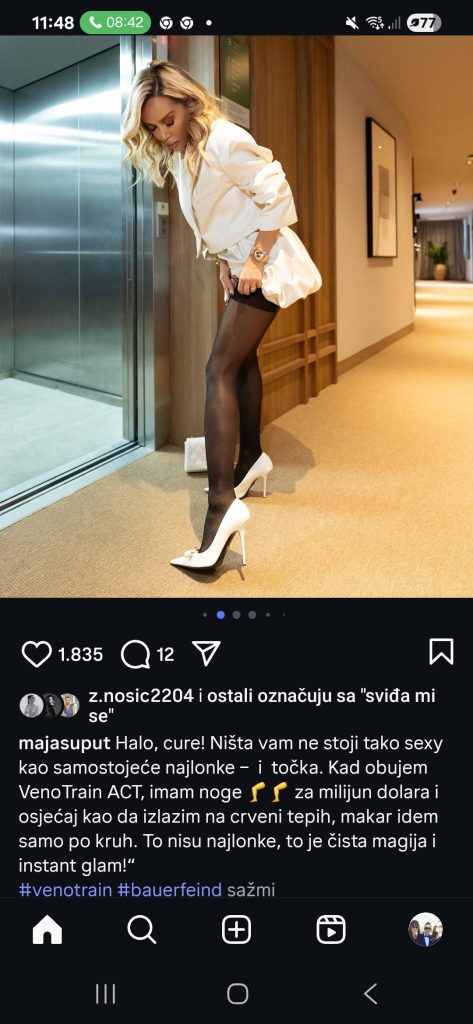 „Halo, cure! Ništa vam ne stoji tako sexy kao samostojeće najlonke – i točka. Kad obujem VenoTrain ACT, imam noge za milijun dolara i osjećaj kao da izlazim na crveni tepih, makar idem samo po kruh. To nisu najlonke, to je čista magija i instant glam!“, napisala je Maja.
