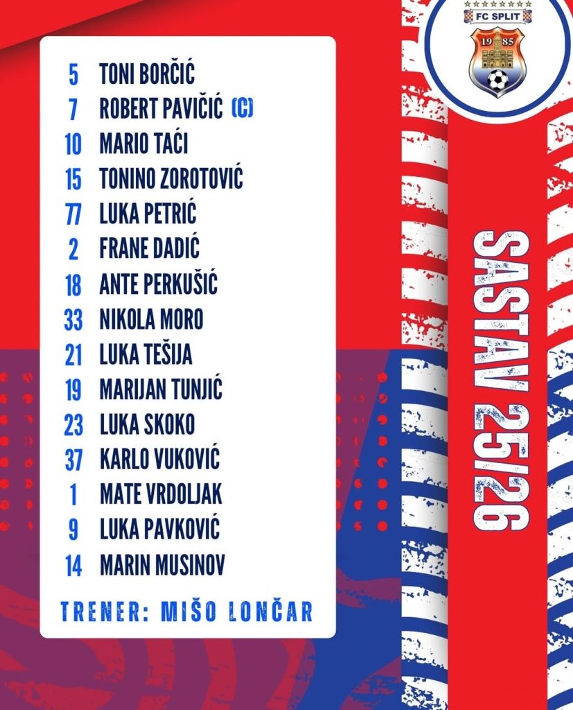 MNK Split objavio je popis igrača za sezonu 2025/26. Pogledajte kompletan sastav, kapetana Roberta Pavičića i trenera Mišu Lončara koji će voditi momčad kroz nove izazove.