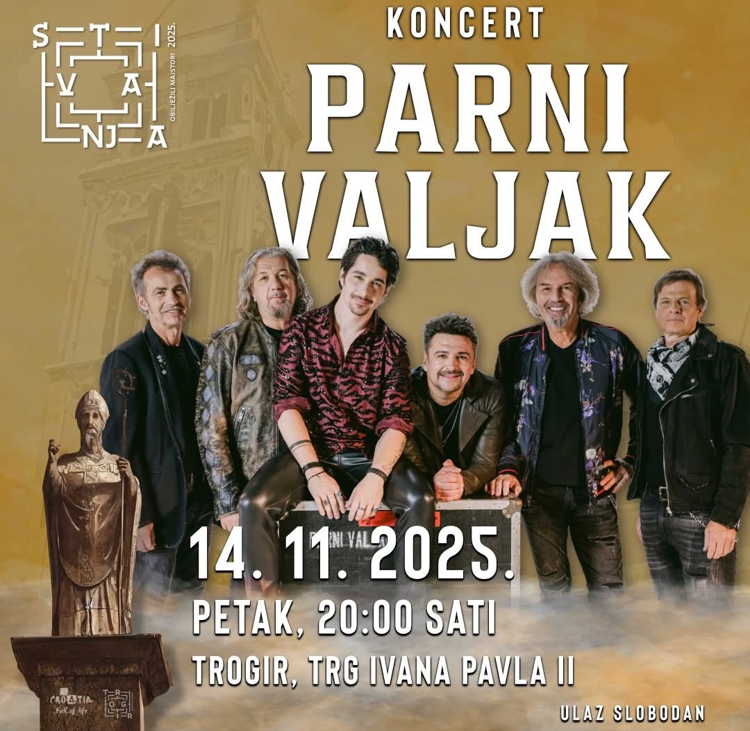 Turistička zajednica grada Trogira najavila je pravi glazbeni spektakl! Povodom Dana grada Trogira, u petak 14. studenog 2025., na predivnom Trgu Ivana Pavla II održat će se besplatan koncert legendarnog benda Parni Valjak. Koncert počinje u 20:00 sati, a ulaz je slobodan za sve posjetitelje.
