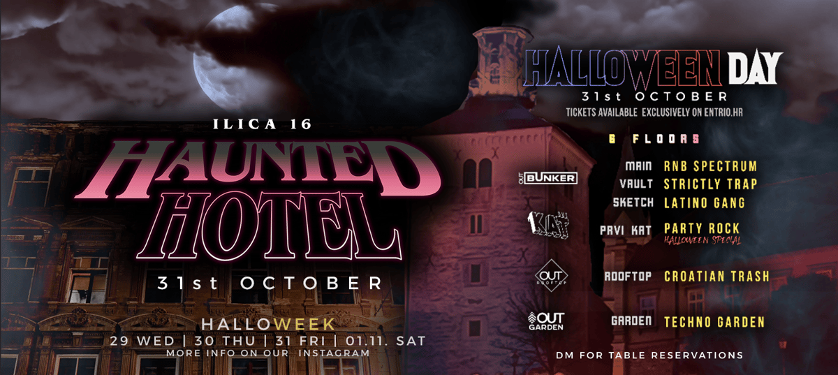 Doživi najluđu noć godine u samom srcu Zagreba! Haunted Hotel u Ilici 16 otvara svoja vrata 31. listopada s 6 katova glazbe – RnB, trap, latino, party rock, techno i trash. Ulaznice dostupne isključivo na Entrio.hr.