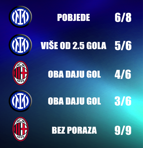 Prošle sezone u prvom međusobnom dvoboju u Serie A Milan je kao gost slavio kod Intera 2:1, a uzvrat je okončan prijateljskim remijem 1:1. No, to je samo dio njihove statistike iz prošle sezone. Početkom godine Milan je pobijedio 3:2 u finalu Superkupa, pa i u travnju nakon dvomeča koji je završio ukupnim rezultatom 4:1 Milanezi prolaze u finale Coppa Italije!