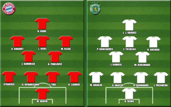 Bayern za sada igra sezonu iz snova u kojoj je već ubacio novi Superkup u svoje vitrine, pa zatim upisao 19 pobjeda, remi i jedan poraz računajući sva natjecanja. Nakon prvih 13 kola Bundeslige bježe drugoplasiranom Leipzigu 8 bodova, imaju gol razliku +40, a jedina momčad koja im je uspjela otkinuti 2 boda bio je Union Berlin početkom studenog. Arsenal je jedina momčad koja je uspjela poraziti Bavarce ove sezone i to na domaćem Emiratesu u prošlom kolu LP rezultatom 3:1. Posljednji poraz Bayerna na domaćem terenu dogodio se 08.04.2025. kada je Inter slavio u osmini finala LP 2:1. Jedino što ne ide u prilog treneru Kompanyu uoči sraza sa Sportingom je suspenzija Diaza koji odrađuje crveni karton iz susreta s PSG-om, te ozljede Musiale i Daviesa koji propuštaju ovaj susret.
