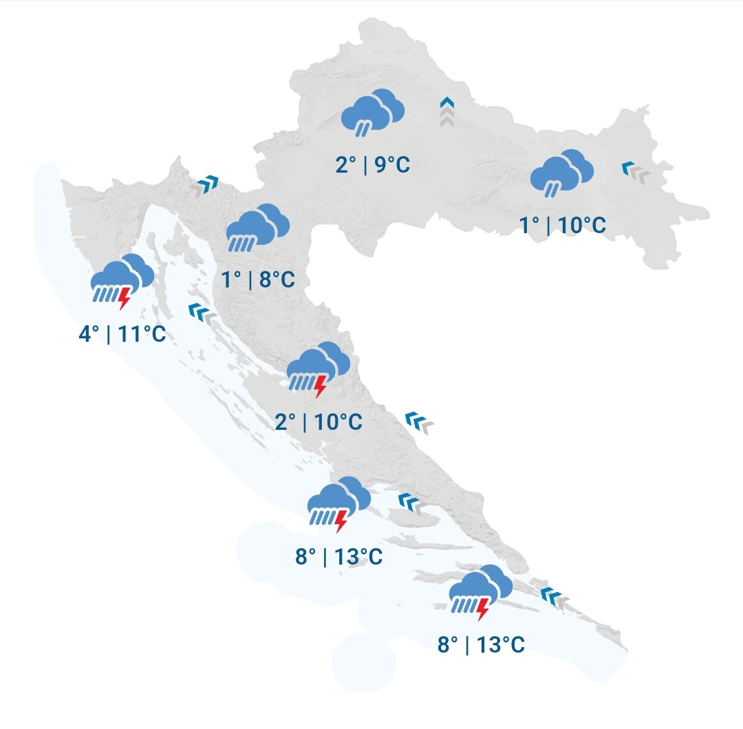 Sve u svemu, sutrašnji dan donosi tipično zimsko, nestabilno vrijeme bez većih temperaturnih ekstrema, ali uz povećan rizik od vremenskih nepogoda, ponajprije na Jadranu i u gorju.