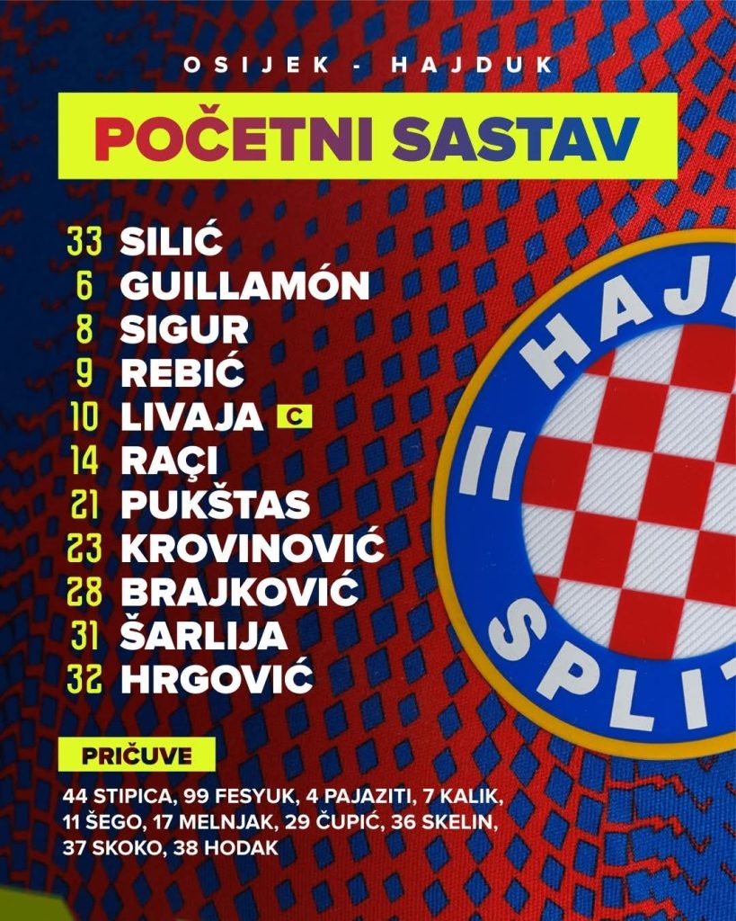 Dvoboj Osijek – Hajduk donosi veliki interes navijača, a objavljen je i početni sastav splitske momčadi za gostovanje u Slavoniji. Trener Bijelih odlučio se za kombinaciju iskustva i energije, uz kapetansku traku Marka Livaje.