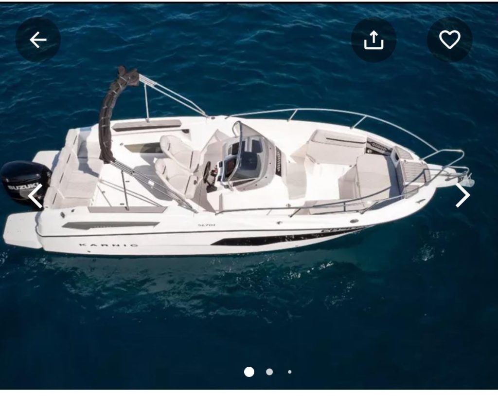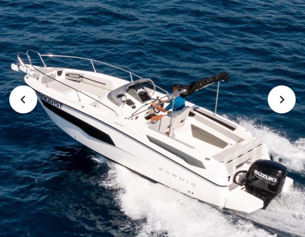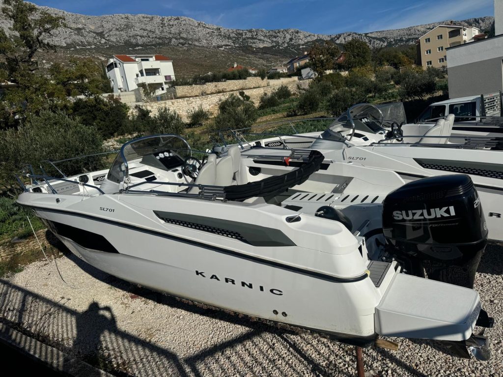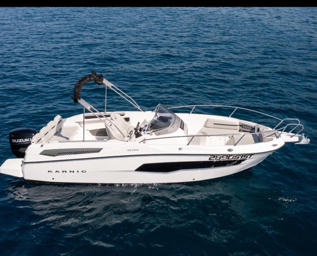 Na prodaju je gliser Karnic SL701 dužine 7,85 metara, model 2025, opremljen snažnim vanbrodskim motorom Suzuki 250 KS (184 kW). Plovilo se nalazi u Splitu, uredno je registrirano pod hrvatskom zastavom te ima aktivno kasko osiguranje do 07/2026.