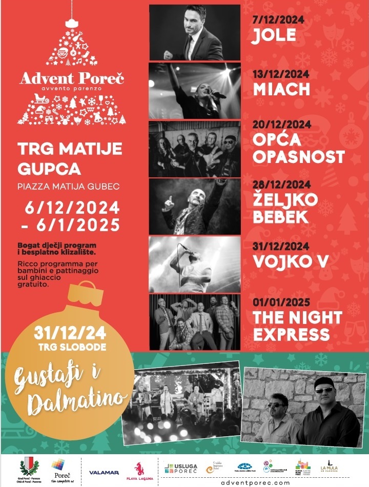 Blagdanski Program i Koncerti Advent Poreč pruža priliku za uživanje u vrhunskim glazbenim nastupima. Na popisu izvođača nalaze se Jole (7. prosinca), Miach (13. prosinca), Opća Opasnost (20. prosinca), Željko Bebek (28. prosinca), Vojko V (31. prosinca) te The Night Express (1. siječnja). Poseban doček Nove godine na Trgu Slobode predvodit će Gustafi i Dalmatino, garantirajući zabavu do ranih jutarnjih sati.