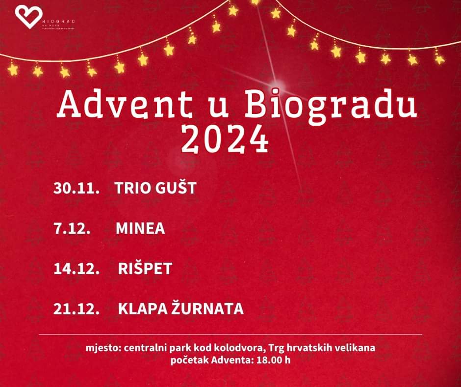 Biograd na Moru ove godine priprema nezaboravan adventski program u Centralnom parku kod kolodvora, Trg hrvatskih velikana, s početkom od 18:00 sati. Blagdanska atmosfera i koncerti renomiranih izvođača oduševit će sve posjetitelje, pružajući im priliku za opuštanje, zabavu i uživanje u čaroliji adventa.