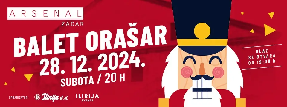 Zadarski Arsenal priprema spektakularnu večer za ljubitelje umjetnosti i kulture! U subotu, 28. prosinca 2024., s početkom u 20:00 sati, uživajte u nezaboravnoj izvedbi svjetski poznatog baleta Orašar. Vrata Arsenala otvaraju se u 19:00 sati, pružajući dovoljno vremena za opuštanje uz topli blagdanski ugođaj.