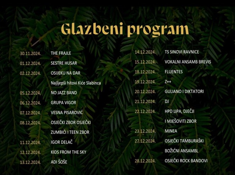 Osijek donosi božićni duh i radosne trenutke kroz raznolik i bogat glazbeni program tijekom prosinca 2024. godine. Uz široku paletu izvođača i glazbenih sastava, stanovnici i posjetitelji moći će uživati u glazbi za sve ukuse i generacije. Program počinje 30. studenog i traje do 28. prosinca 2024. godine.