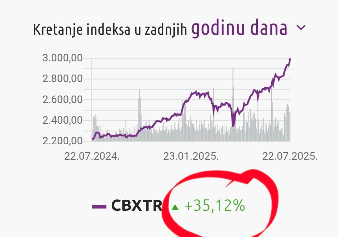 U razdoblju od 22. srpnja 2024. do 22. srpnja 2025., domaći burzovni indeks CBXTR ostvario je izvanredan rast od +35,12%, dosegnuvši najviše razine u svojoj povijesti. Ovaj trend potvrđuje snažno povjerenje investitora u domaće tržište kapitala te signalizira povoljne makroekonomske uvjete i pozitivne pomake u poslovanju kompanija koje čine indeks.
