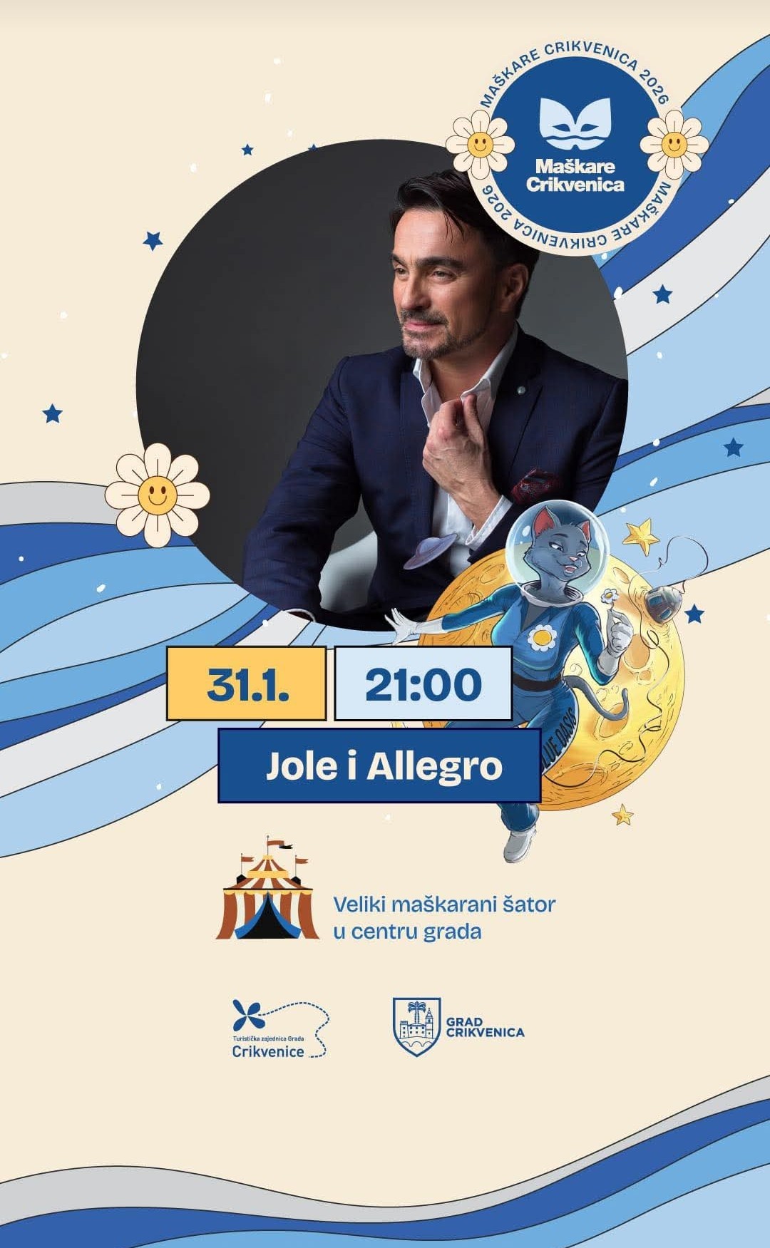 Crikvenica” će u petak, 31. siječnja 2026. godine, biti središte dobre zabave i karnevalskog raspoloženja jer u sklopu manifestacije Maškare Crikvenica 2026 na pozornicu velikog maškaranog šatora stiže Jole”,” i Allegro. Koncert počinje u 21:00 sat, a očekuje se večer ispunjena hitovima, plesom i vrhunskom atmosferom.