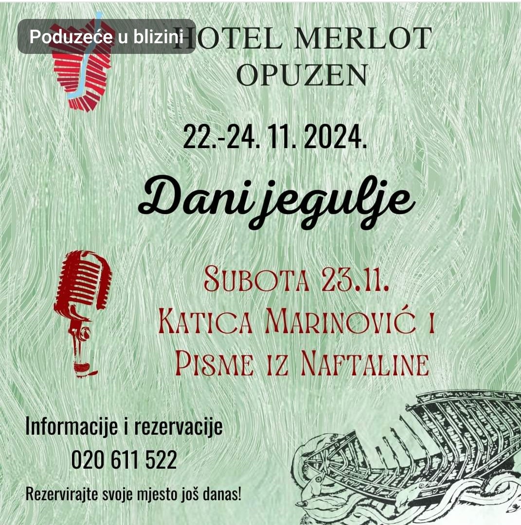 Hotel Merlot u Opuzenu organizira nezaboravno događanje posvećeno ljubiteljima tradicionalne dalmatinske kuhinje – Dani jegulje, koji će se održati od 22. do 24. studenog 2024. godine. Ovo trodnevno gastronomsko iskustvo nudi posjetiteljima priliku da uživaju u autentičnim jelima od jegulje, pripremljenima na tradicionalan način.