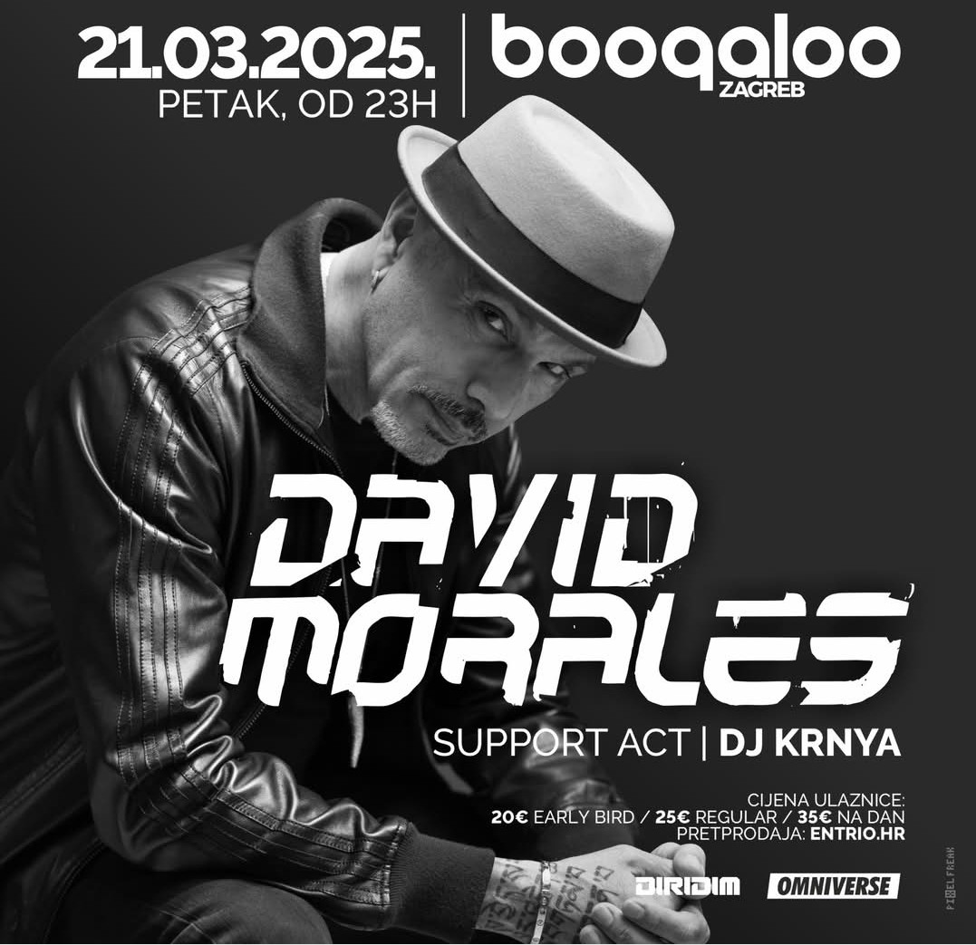David Morales donosi nezaboravan house set koji uključuje njegove kultne remikse i nove hitove. Ovu noć dodatno će začiniti podrška domaćeg DJ-a Krnya, koji će zagrijati publiku prije glavnog nastupa. S početkom u 23:00 sata, Boogaloo će postati središte vrhunske elektronske glazbe.